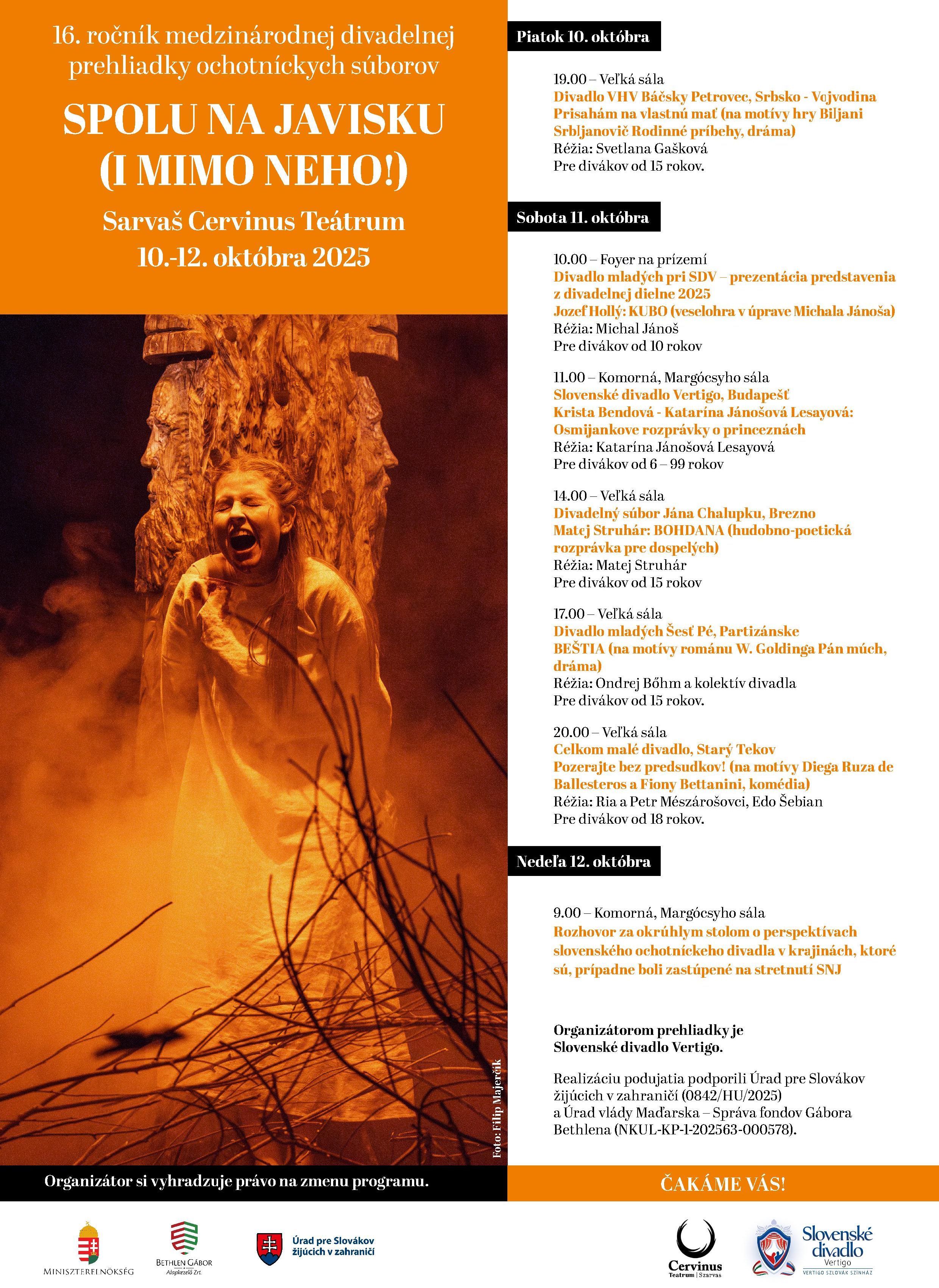 V dňoch 10. – 12. októbra 2025 sa priestory kultúrneho stánku Cervinus Teátrum v Sarvaši zaplnia pred javiskom – divákmi, aj na javisku – hercami. Slovenské divadlo Vertigo tu organizuje 16. ročník medzinárodnej prehliadky Spolu na javisku (SNJ), v rámci ktorej sa v divadelnej sále Cervinusu predstavia divadelné súbory zo Slovenska, Srbska – Vojvodiny a Maďarska. Divadlo VHV z Báčskeho Petrovca prináša celkom nové predstavenie, krutú drámu významnej srbskej dramatičky Biljany Srbljanovič Rodinné príbehy, ktorá sa zaoberá témou rozpadnutých rodín, videnou očami detí. Zo Slovenska privítame Divadelný súbor Jána Chalupku z Brezna s hudobno-poetickou rozprávkou pre dospelých Bohdana– predstavenie už získalo nejedno ocenenie. Už viacnásobný účastník prehliadky SNJ – Divadlo mladých Šesť Pé z Partizánskeho tentokrát siahlo po kultovom románe W. Goldinga Pán múch, predstavenie nazvalo Beštia. Celkom malé divadlo zo Starého Tekova prináša šteklivú komédiu Pozerajte bez predsudkov, zameranú na partnerské vzťahy. Organizátor prehliadky – Slovenské divadlo Vertigo – zastupujú dve predstavenia: jednak obnovená inscenácia predstavenia pre deti Osmijankove rozprávky o princeznách a ukážka výsledkov tohtoročnej letnej divadelnej dielne mladých, úprava obľúbenej veselohry Jozefa Hollého Kubo. Dovoľte, aby sme Vás srdečne pozvali na predstavenia – je naozaj z čoho si vybrať!