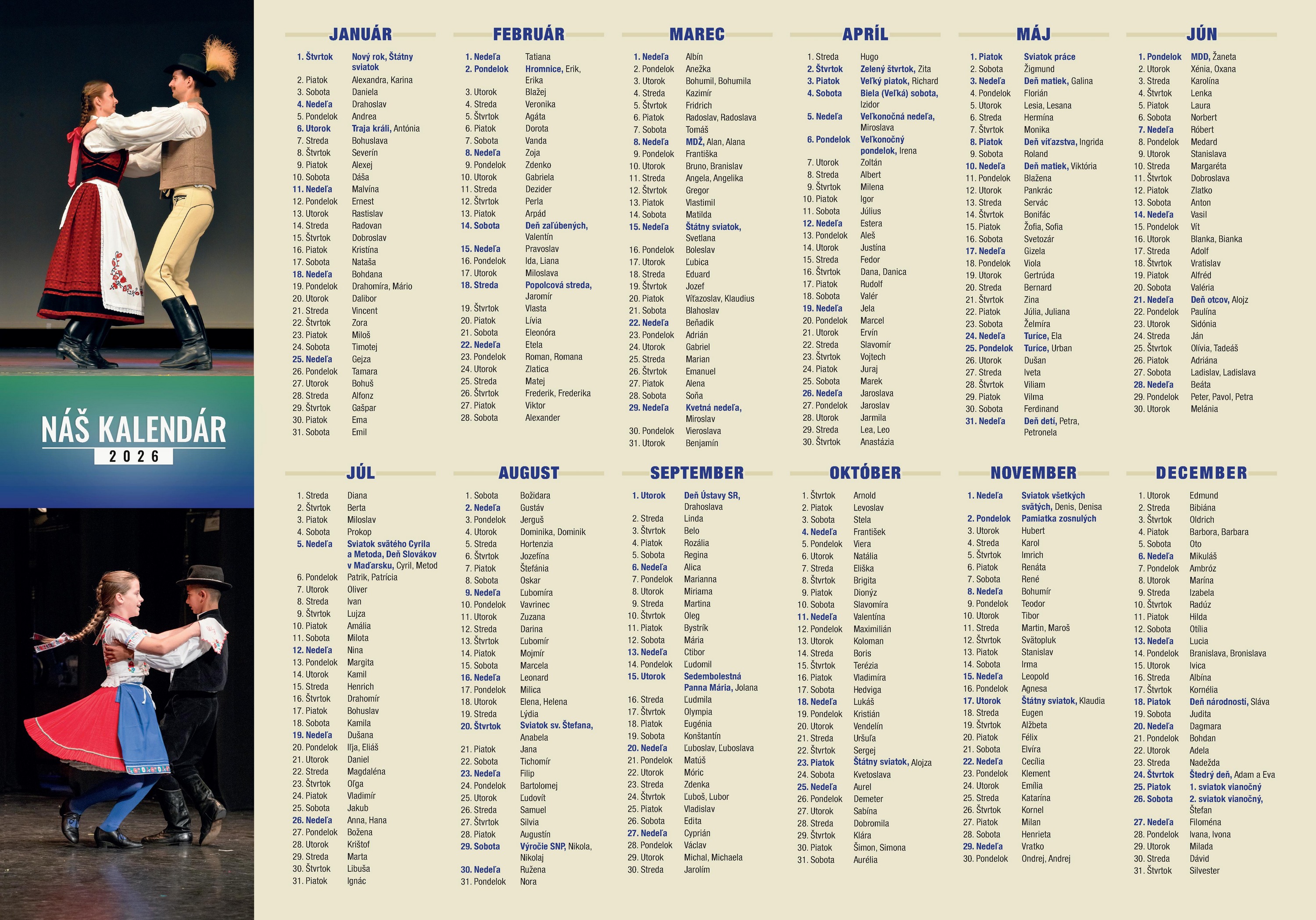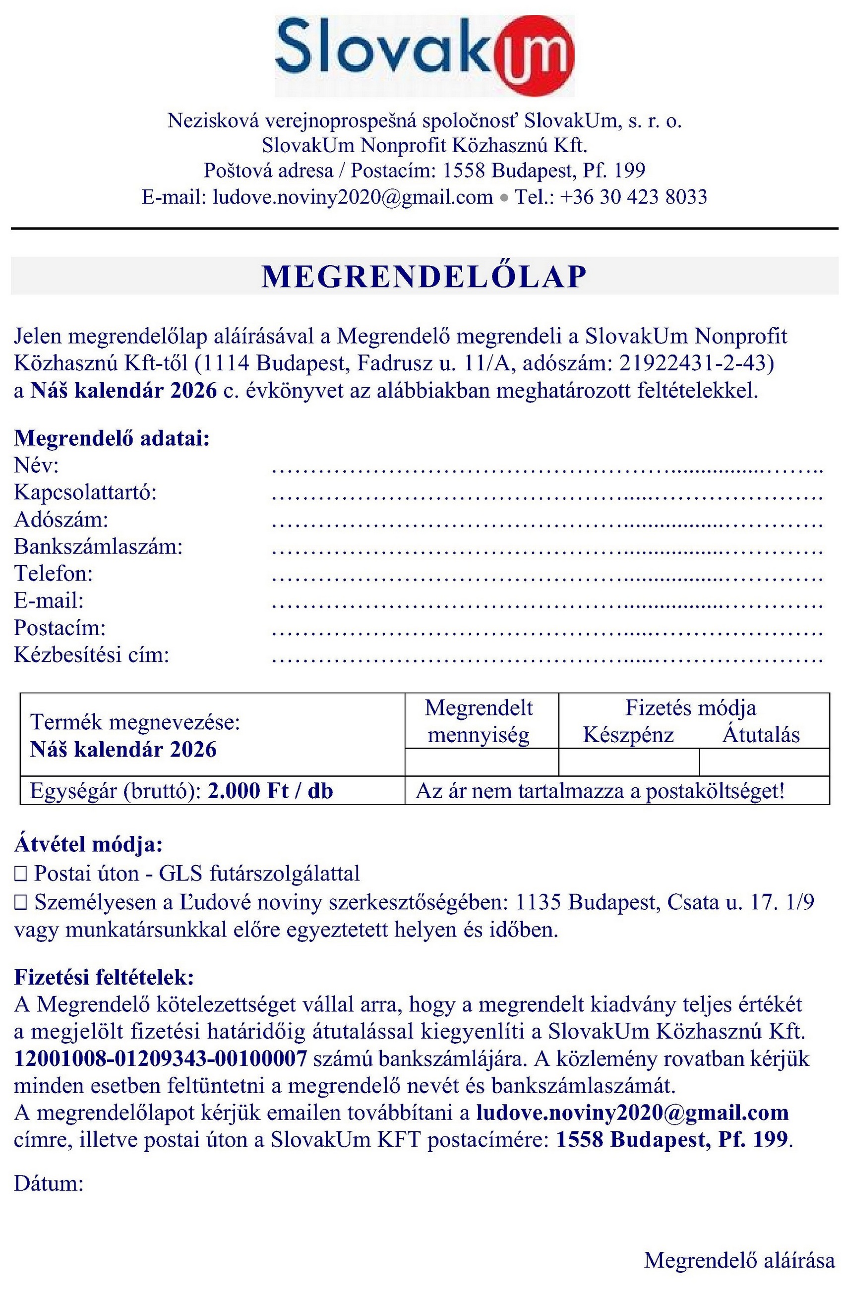 Milí priatelia, priaznivci, rozširovatelia a čitatelia obľúbenej ročenky Slovákov v Maďarsku, koncom novembra vyjde Náš kalendár na rok 2026. Obraciame sa na Vás s prosbou o pomoc, aby publikácia Celoštátnej slovenskej samosprávy v Maďarsku, vydavateľom ktorej je Nezisková verejnoprospešná spoločnosť SlovakUm s. r. o., čo najrýchlejšie sa dostala do domácností našich Slovákov. Našim cieľom bolo, aby Náš kalendár na rok 2026 umožnil čitateľom nazrieť do rozmanitého života slovenskej národnosti v Maďarsku - prezentujúc tohtoročné udalosti zachytené objektívom fotoaparátu, sériu politicko-spoločenských a kultúrnych podujatí, ako aj činnosť našich školákov a mládeže, a to s netajenými ambíciami, aby nová ročenka bola niečím viac než „iba“ kronikou našej Slovače. Snažili sme sa o to, aby Náš kalendár na rok 2026 bol obsahovo, tematicky a žánrovo pestrým, praktickým, zároveň hodnotným a podnetným čítaním. Na stránkach kalendára na rok 2026 vám priblížime prácu našich občianskych organizácií, inštitúcií CSSM a slovenských volených zborov, ako aj ďalších slovenských kolektívov pôsobiacich v rôznych kútoch krajiny. V ročenke predstavujeme 12 našich významných folkloristov, prinášame rozhovory s významnými osobnosťami Slovákov v Maďarsku, osobitné rubriky venujeme histórii a literatúre, zostáva pritom primeraný priestor aj pre umenie, zábavné čítanie, krížovky, recepty a humor. V prílohe Vám zasielame objednávku (megrendelőlap) na Náš kalendár 2026 (ktorú si môžete stiahnuť aj odtiaľto):